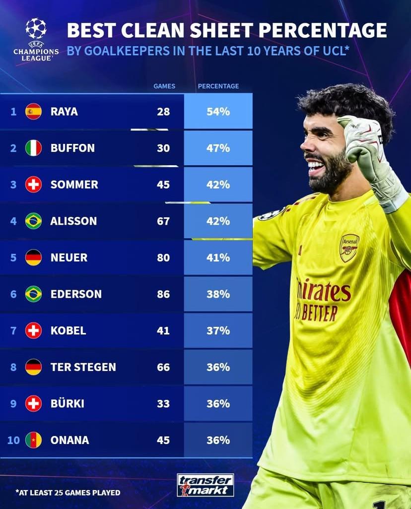 北京時間12月11日,德轉列出了歐冠近10年出戰至少25場比賽的門將零封率前10,阿森納的戴維-拉亞以54%的零封率高居第一,布馮47%排名第二,索默和阿利松同以42%的零封率并列第三,奧納納36%上榜。
