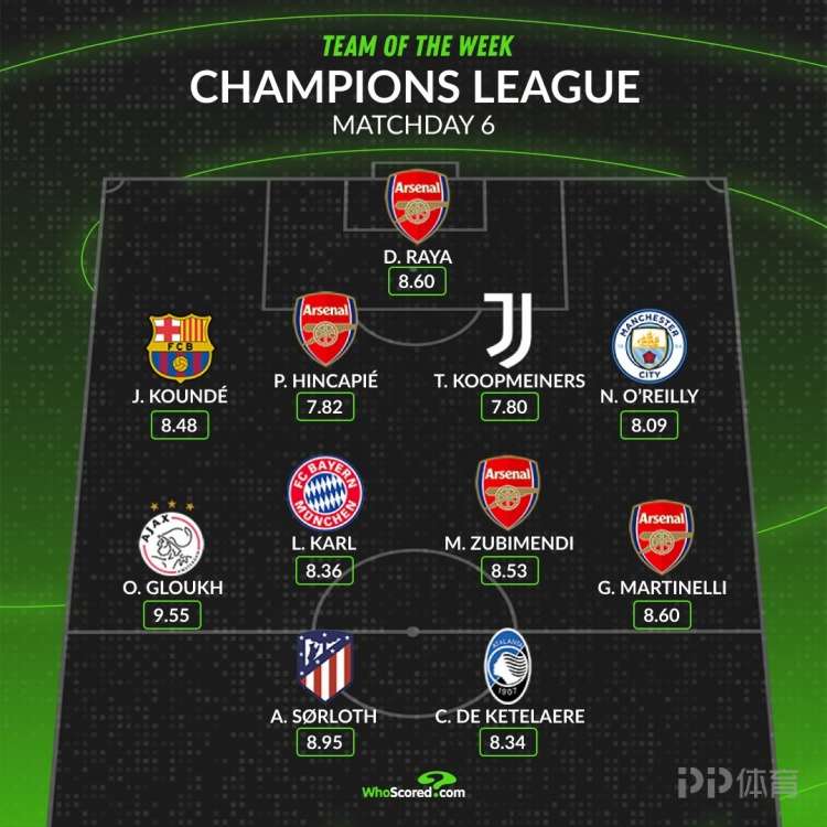 WhoScored根據球員的評分列出了歐冠第6輪最佳陣容,馬丁內利、卡爾、孔德、拉亞在列,阿森納4名球員入選。